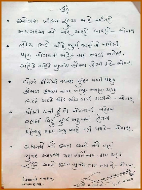 A devotee shared a special gift that she received from Pujya Swamiji, a poem composition (lyrics & audio), in response to her flower offering.