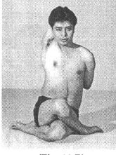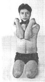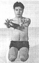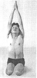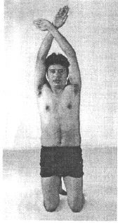 12. Now get the body straight up between the buttocks and waist while you sit in Vajrasana. Thus one will have to stand up with the support of knee joint and two upper parts of the legs. The whole body will assume a shape of right angle. Now, keep both the hands right from the shoulder completely away from the chest and move round both the hands in opposite directions such that hands cross each other.
