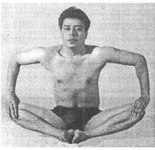 (1) Sit down on the ground. Bend the legs from the knees in such a way that both heels and paws remain together and the legs remain opposite each other. This will allow both the knees to assume a shape of wings of a butterfly in opposite directions. Now hold both the paws at a time by both the hands and move the knees up and down like moving of wings of a butterfly Repeat this 16 to 32 times.