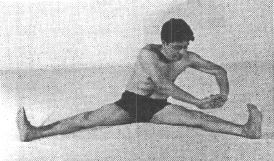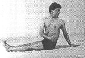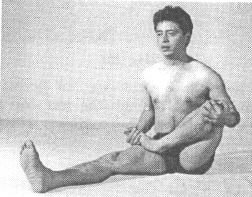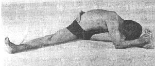 9. So far exercises were performed with both the legs stretched forward together. Now sit with both the legs on the ground in the widespread position. Using the right hand, catch hold of thumb of the left leg. Take your left hand round the back side. Now bend forward with body twisted such that your head touches the left knee. This process should be repeated on both the sides 6 to 12 times.