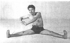 10. Sit with both legs stretched and kept wide apart as much as possible. Stretch both the hands forward. Lock the fingers in the direction opposing the face. Now as if you are grinding wheat in a two wheel country type grinding machine move both the hands, keeping them absolutely straight and parallel to the ground, in a circular motion so that you can touch the toes of both the legs.